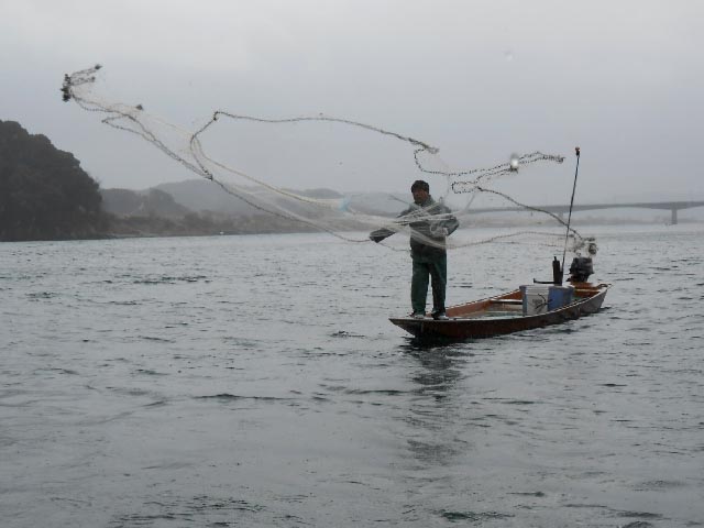 そんな感じで船が進むと、お仕事中の漁師さんに遭遇。暫し見学です。