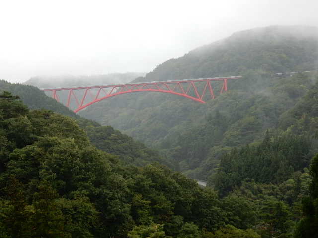 赤いアーチ橋が見える辺りが最高地点ですかね?雨の中に煙る