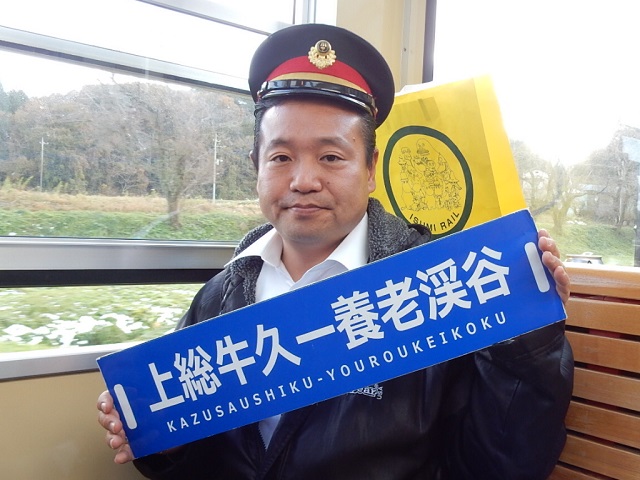 車掌さんが記念写真用の制帽とサボを持って回ってきましたので一枚。