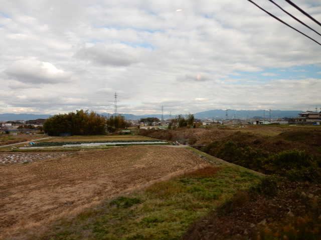 緩やかに傾斜していく土地の先が奈良盆地、背後が二上山です。