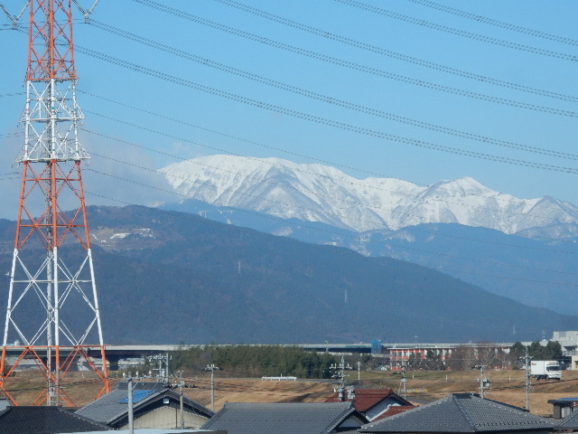 車窓の遠景には、雪を頂く伊吹山が見えております。