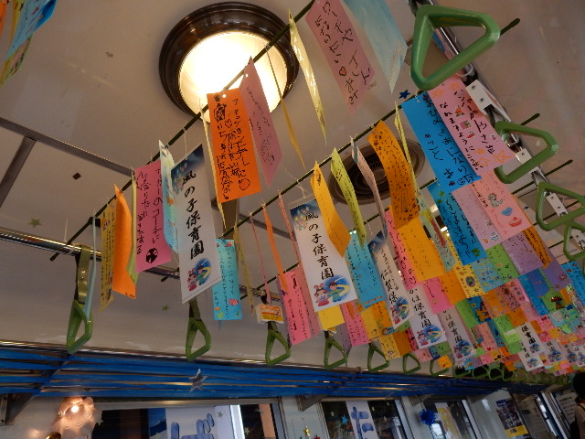 荷物棚に張られた青いビニール紐は、天の川のイメージでしょうか?