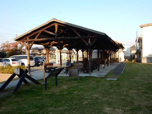 元の貨物ホームの上屋が休憩スペースとして残されており、横には
