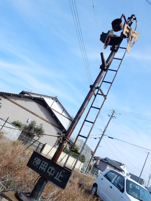 こういうプレートは、裏返すと「踏切注意」とか何とか、通常使用時の