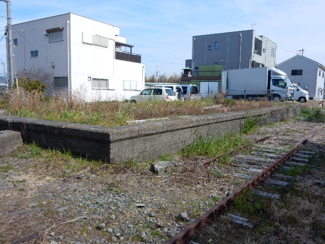 分岐器部分を含む何本かのレールと、駅ホームの跡が残ってました。