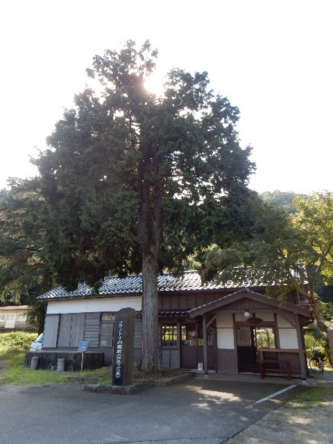 昭和4年の開業当時の木造駅舎と、駅舎前の大きな樹(種類不明)が