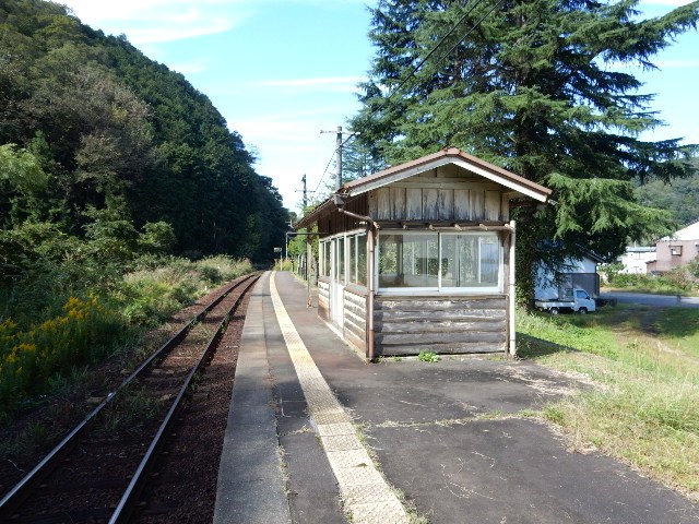 ホームには撤去された側の線路の一部と、駅前には次の豊岡までの