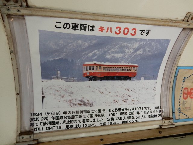 車内にある解説書きによると、キハ303号は昭和9年製で元は鉄道省