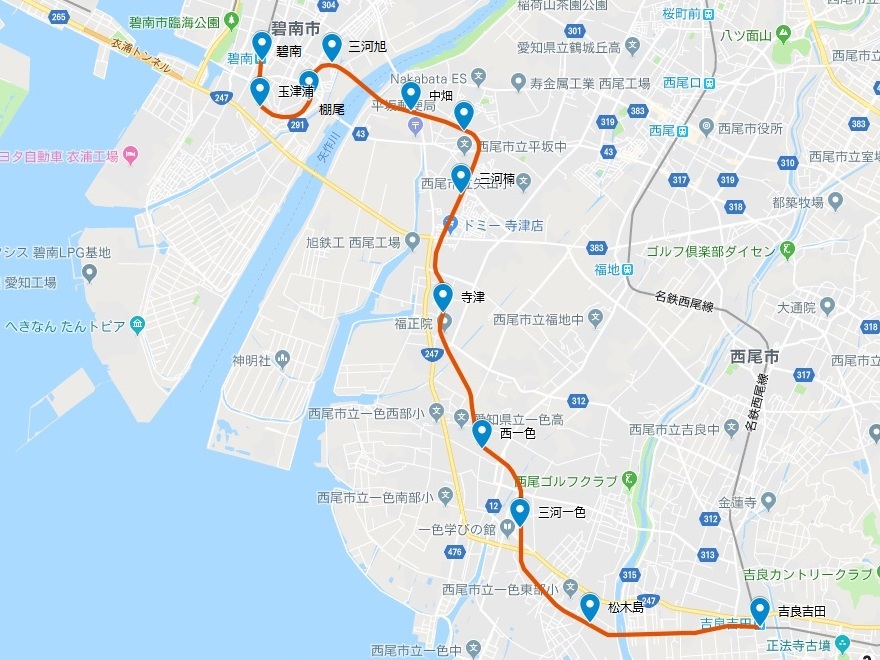 廃線区間は碧南を出発すると、大きなカーブを描く感じで南東方向へ