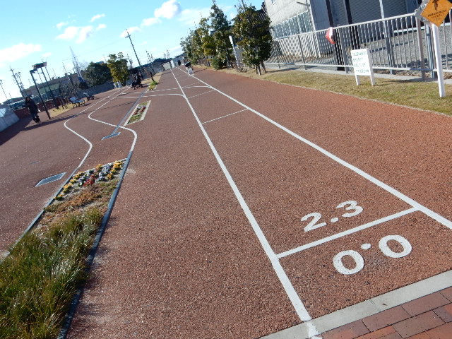 元の線路跡が遊歩道になり、線路をイメージしたデザインのラインが