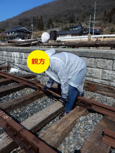 1人当たり枕木2本程度、交代でガンガン打ちました。些か浮いてる