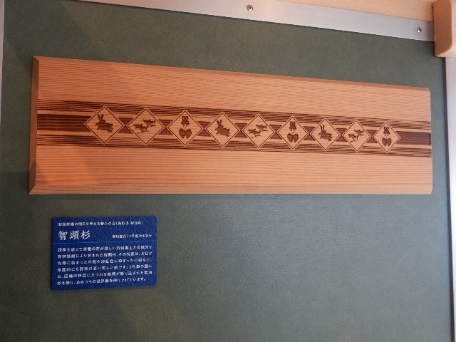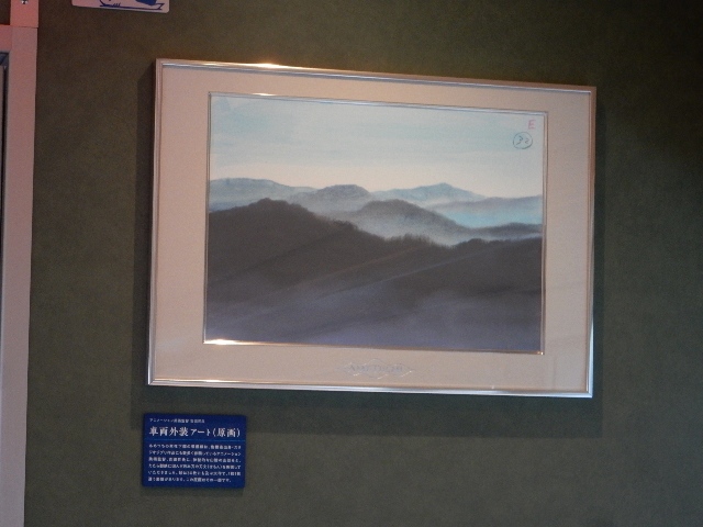 木材(智頭杉)を使ったレリーフや、車体デザインの原画などが展示