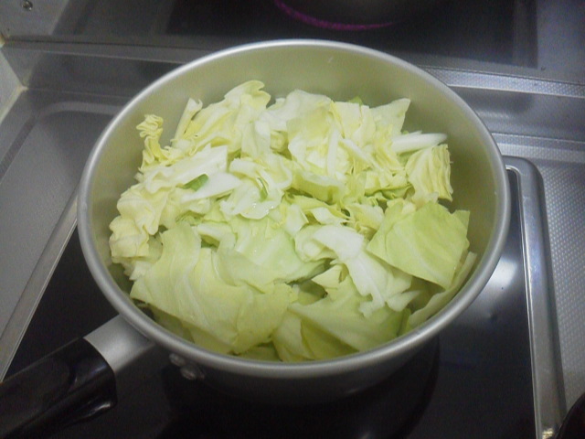 まずは、キャベツを少量のお湯で茹で