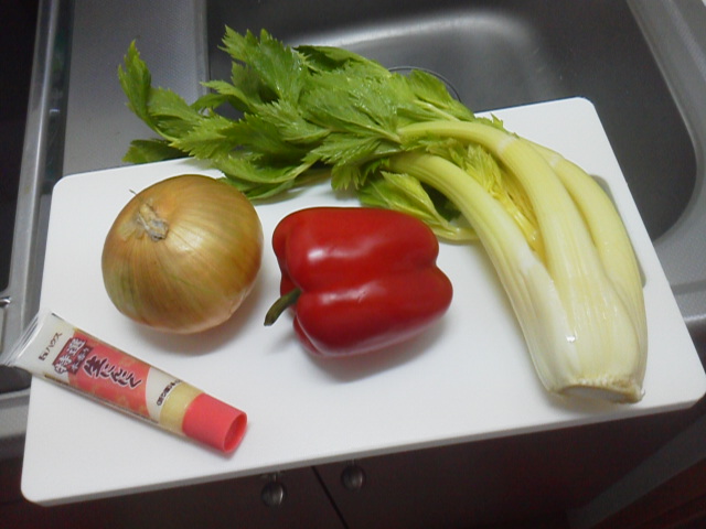 この日買ってきたのが、タマネギ1個・セロリ1束・パプリカ1個、