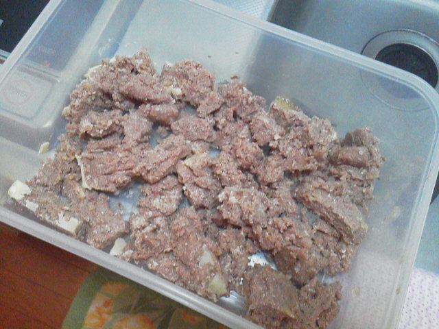 平行して、タッパに缶詰のコンビーフを開け、細かくホグす。