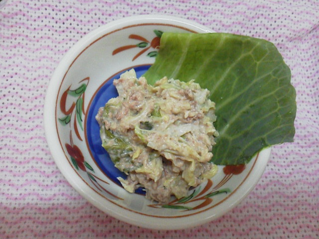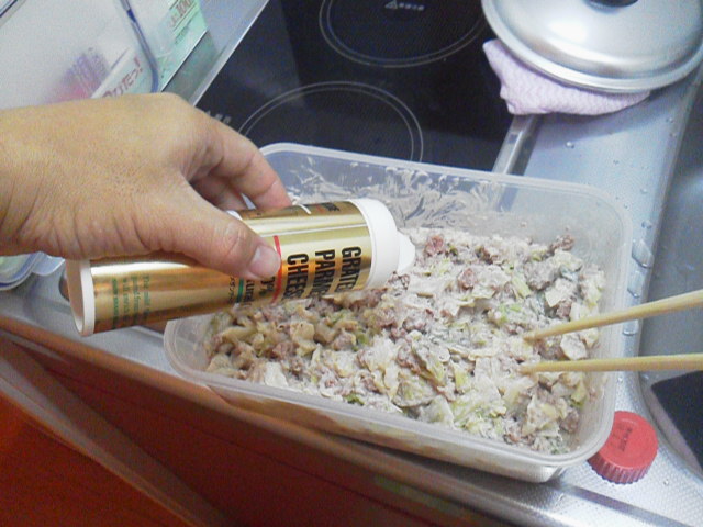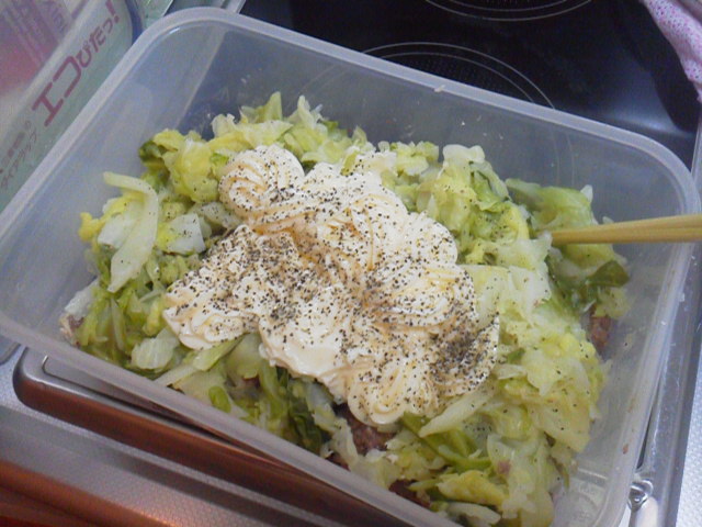 キャベツをタッパに合わせ、マヨネーズ、黒胡椒、粉チーズなどで調味。