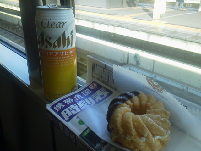で、サキイカやチーズカマボコに飽きたので、ドーナツをアテに飲む