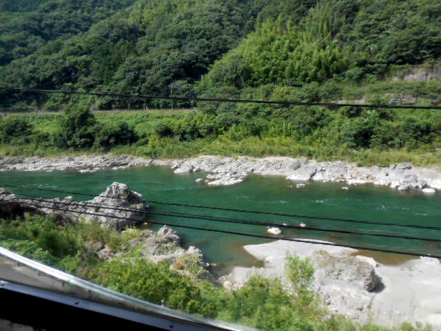 おやつタイム。車窓には球磨川が寄り添ってます。