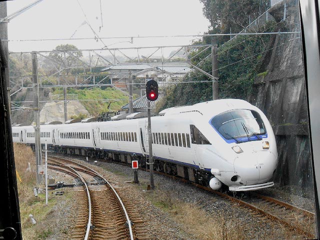 さて長崎本線です。海沿いの信号所で待ってると、向こうから