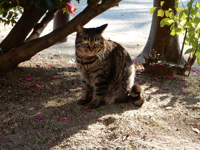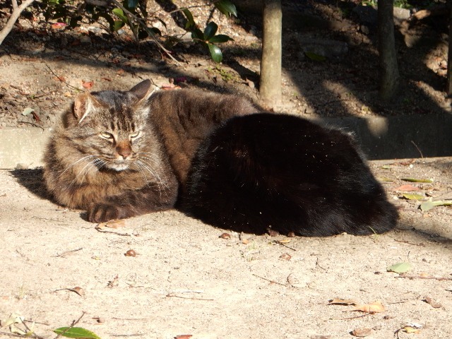 木陰にキジトラちゃんが1匹。…更に別の場所に、先程の黒ちゃんと