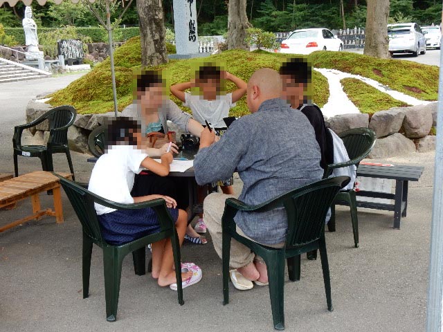お坊さんに話を聞いてる家族連れ