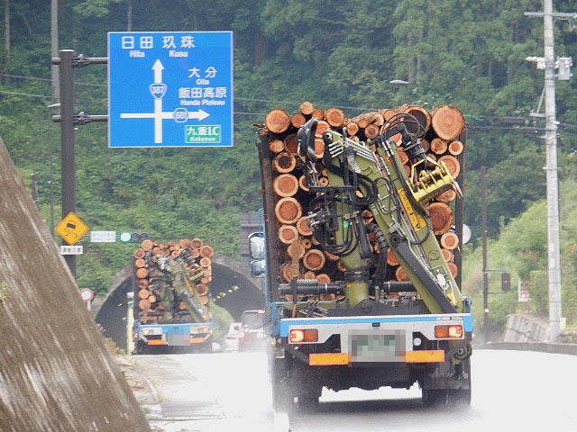原木を積んだ大きなトラックが頻繁に