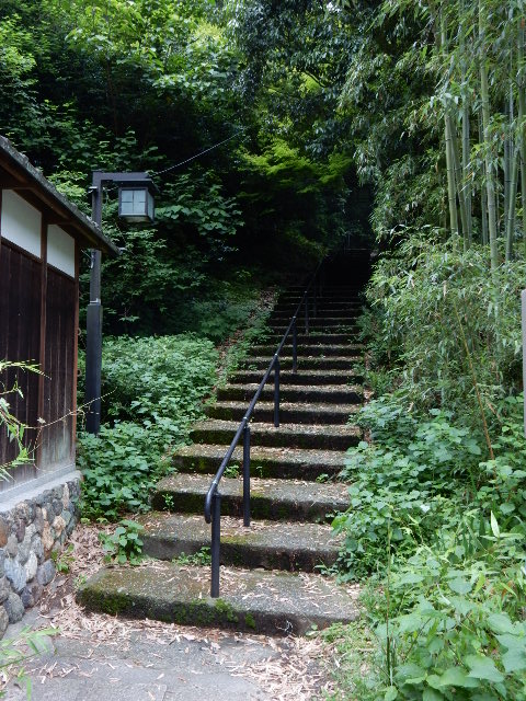 上の府道29号線…要するに元の愛宕山鉄道の線路へ登る古い石段