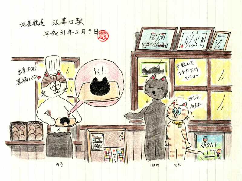 ものをリメイクして、現地のノートに描こうという事で「黒猫パン」で。