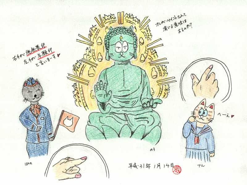 バスガイドさん役のぱの解説の通り右手「施無畏(せむい)印」