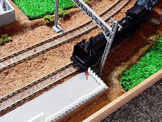 カーブからすぐに駅のホームになってる箇所で、機関車の前部左側の