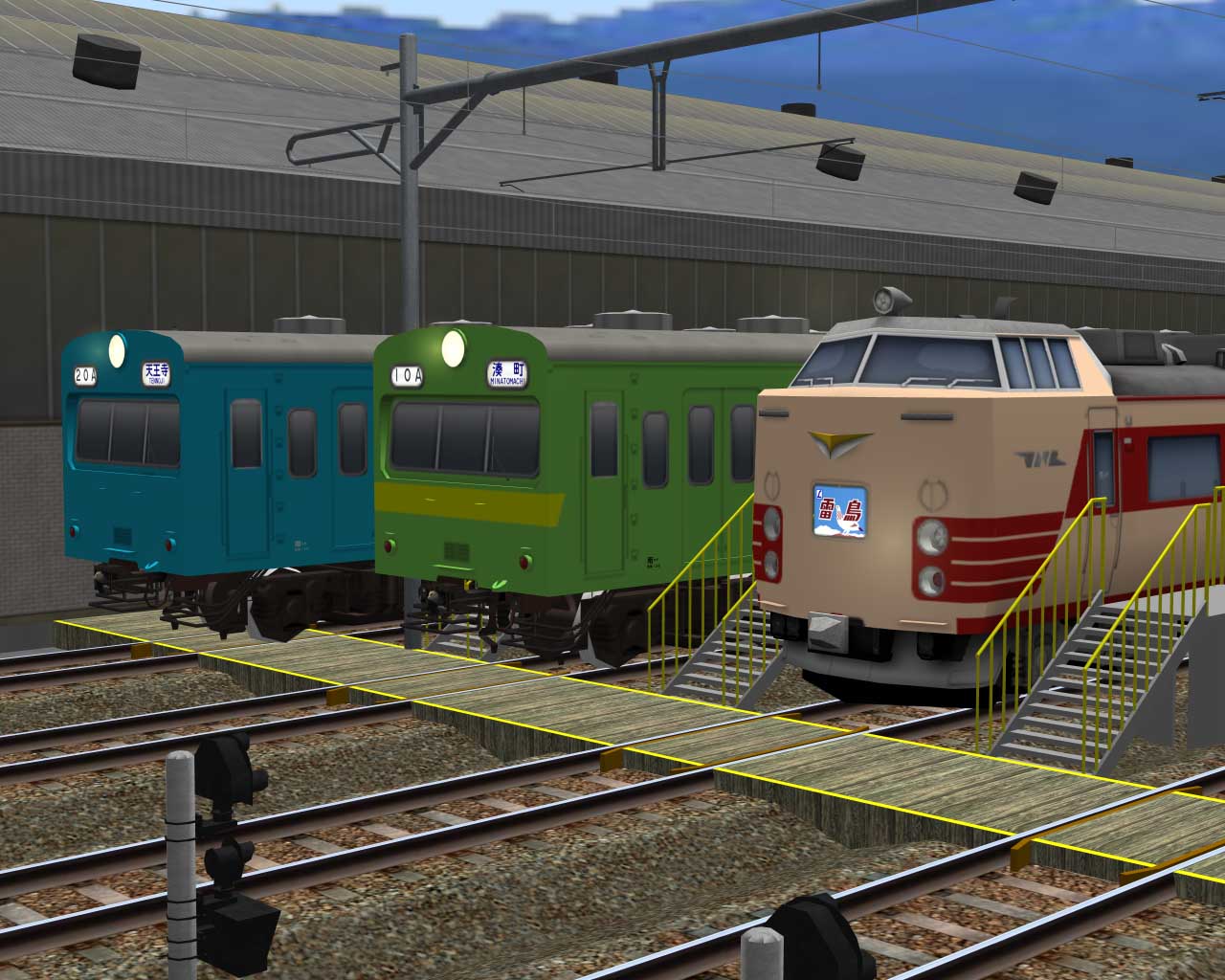国鉄っぽいの好き。 ウグイス色の103系は、 勝手に前面帯を描き足してやりました。 …関西本線仕様です。 ついでの事に方向幕も改造…。 「国鉄フォント」って便利。
