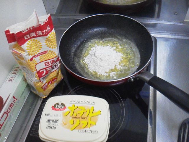 「貧乏お好み焼き」をやった時の小麦粉をマーガリンでソテーして
