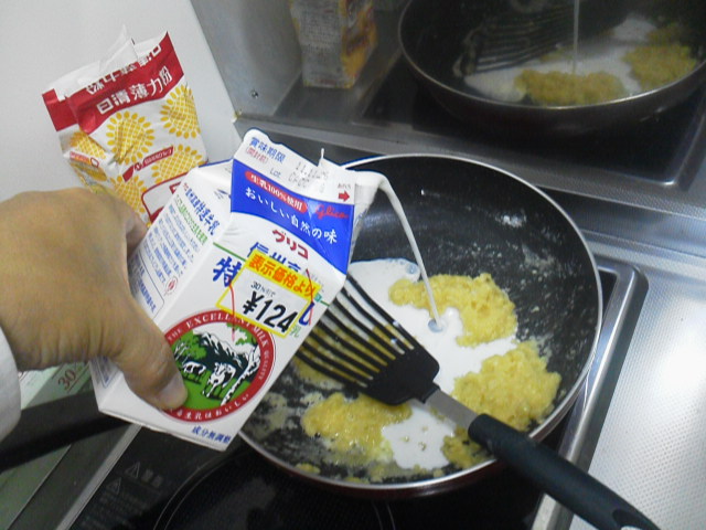 牛乳を加える。…よく見たら、この牛乳も見切品ですね。