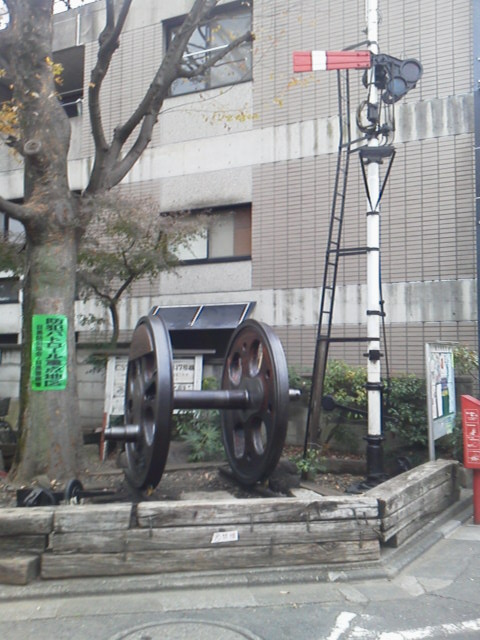 SLの動輪と腕木信号機が置いてある