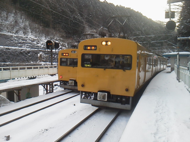雪のホームでラジオ体操