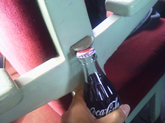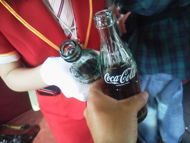 瓶のコーラを車内の栓抜きで開けて乾杯し