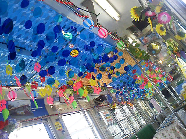 車内は夏らしい装飾に溢れてますねぇ。前後に各1名ずつアテンダントの