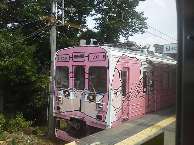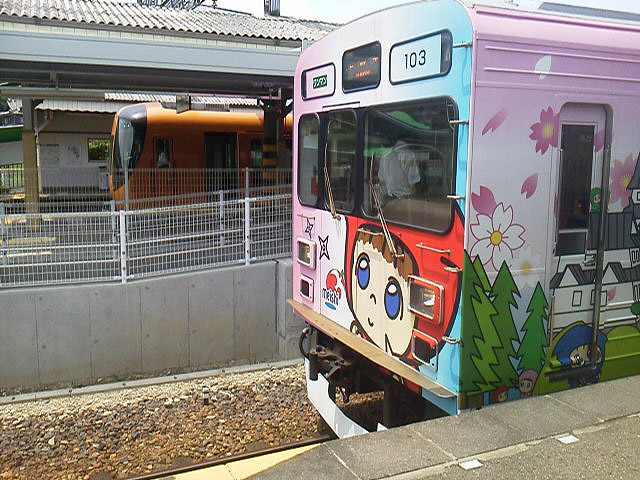 単線区間なので、途中駅で対向列車と交換…忍者列車のピンクと