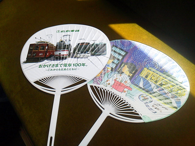 行きました。そしたら、隣の席の方が広島電鉄のウチワなんですよ。
