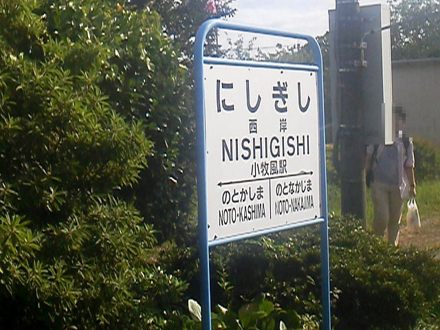 西岸駅には、アニメに登場した駅名を再現した駅名表も建ってました。
