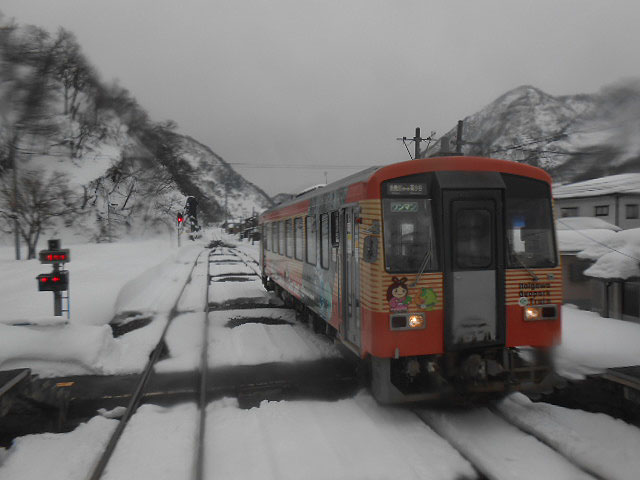 根知駅で下り列車(423D)と交換。こっちはオリジナルのラッピング車両