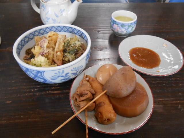 天麩羅そばと関東煮を頼んだら、天麩羅が「山菜をその場で揚げる」