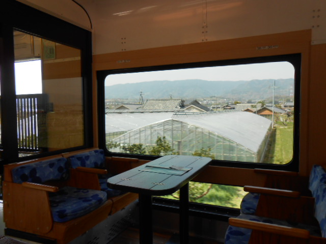 普通に進行方向を向いた方が落ち着くのと、テーブルが広いから