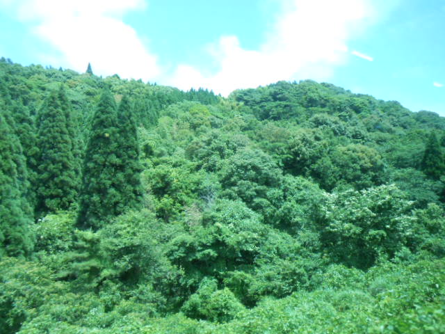 UVカットガラスのせいで微妙な色合いですが、山の緑と青空が美しい。