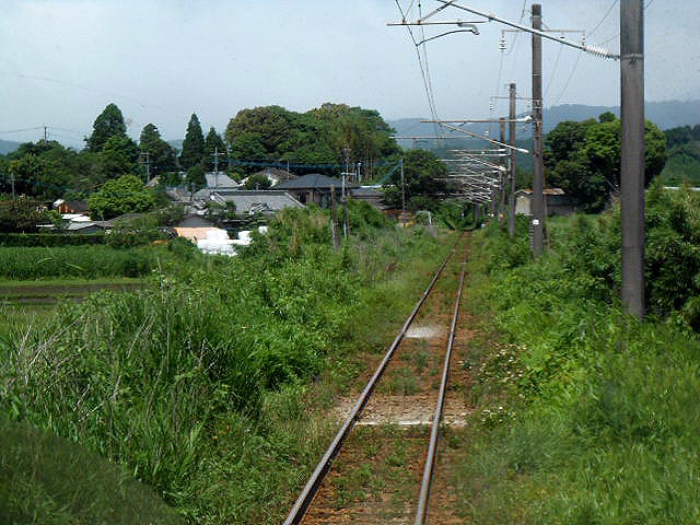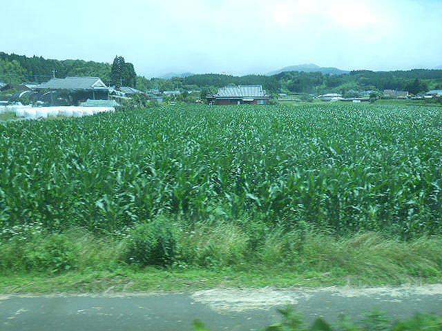 草に埋もれた単線の線路と、車窓には夏らしくトウモロコシの畑。