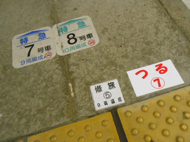 で、時々特急が停まるらしいです。ホームの随所に「乗車位置目標」