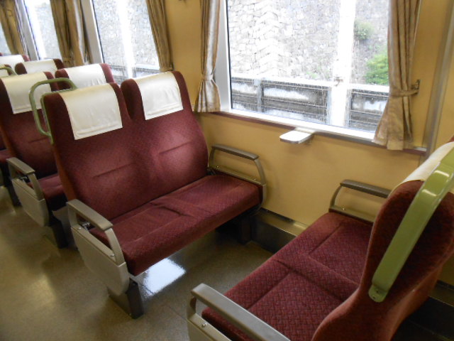 内装は転換クロスシート。生地がちょっとゴージャスな色合いです。