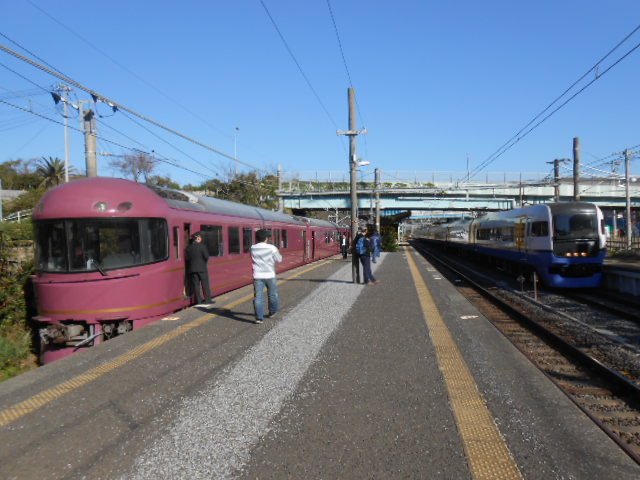 発車直前、向かいのホームに255系が滑り込むサプライズ。
