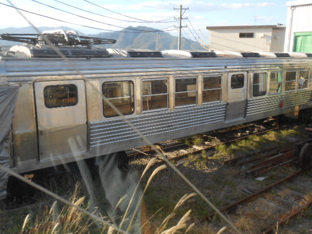 …途中の車庫に、何か古めかしいステンレス車が