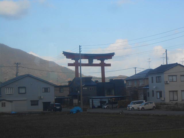 そのまま、ほぼ一直線に線路は進み、車窓の右手に巨大な鳥居が!